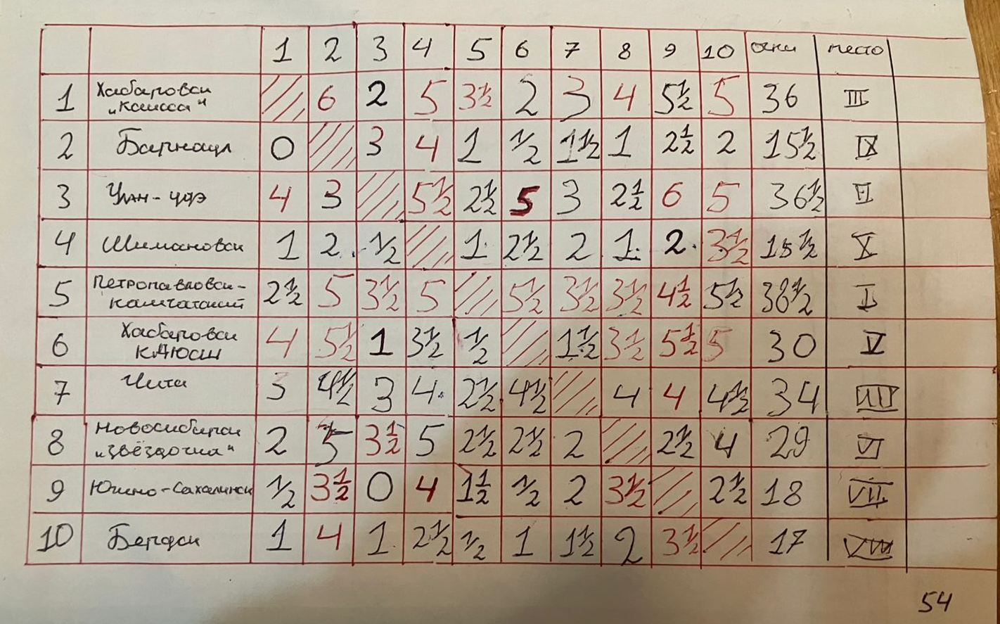 А самое высокое заняла в итоге «ДЮСШ № 1» Петропавловска-Камчатского, набравшая 38,5 очков из 54. Она проиграла только один матч («Каиссе» из Хабаровска с минимальным счетом). У представителей Камчатки два лучших результата по доскам (П. Котыхов - на первой, П. Задорожный – на четвертой).