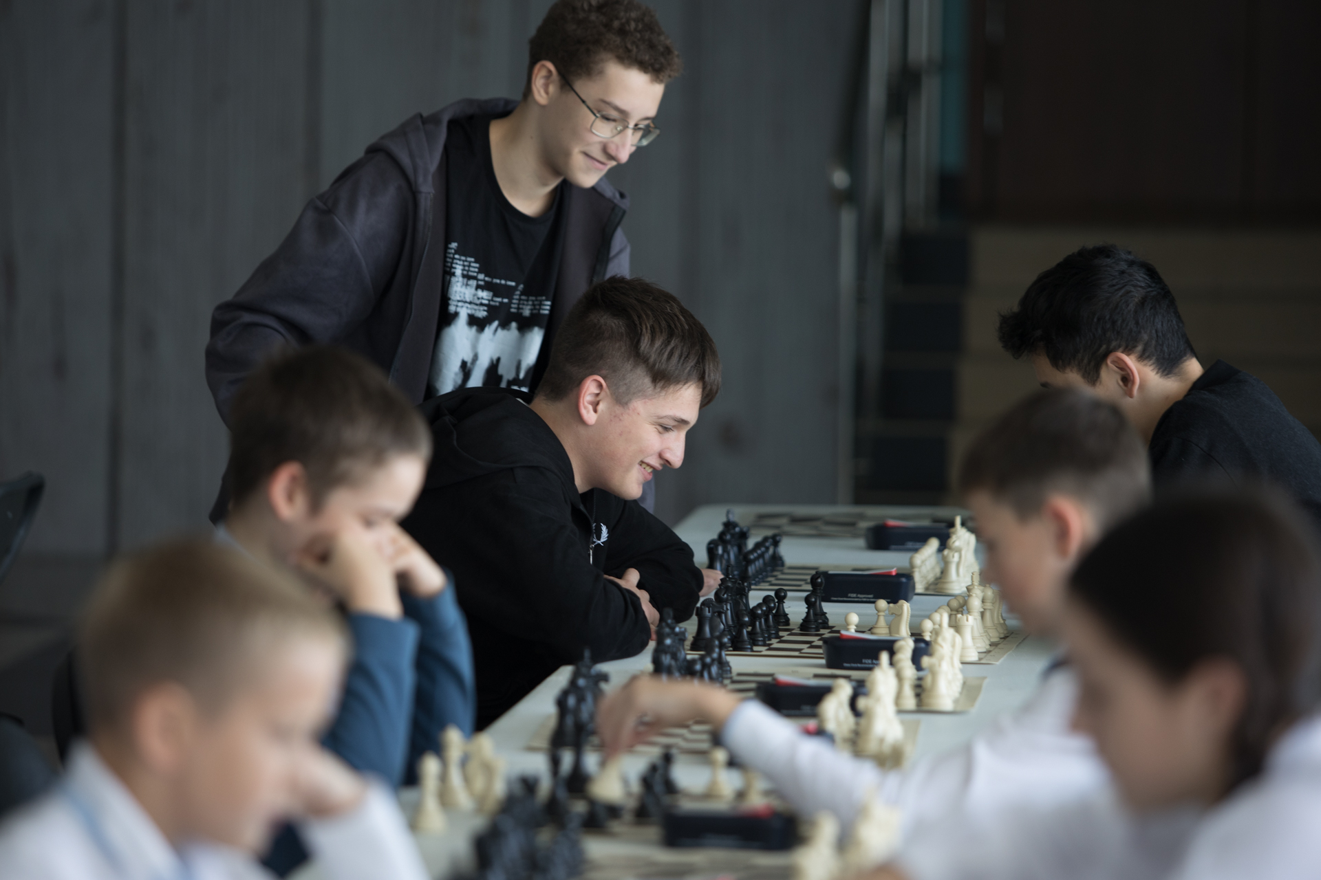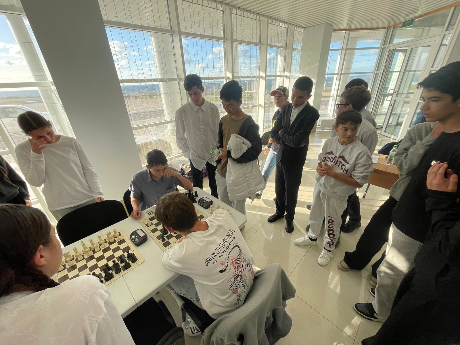 Еще одним важным событием был сеанс одновременной игры в Горном. За доски здесь в основном сели младшие школьники. Но и «старшаки» тоже подходили, чтобы сыграть с титулованным сеансёром.