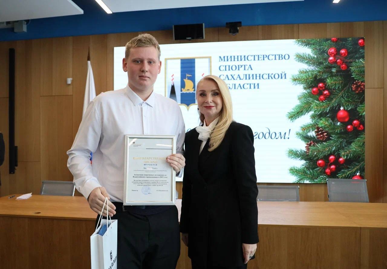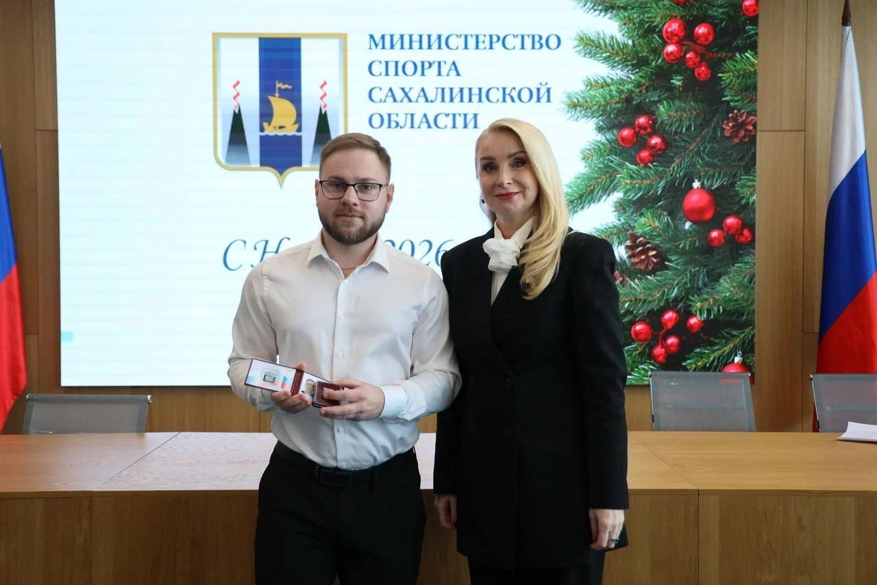 Заместитель министра спорта Сахалинской области Светлана Ходюш наградила благодарностью Министерства спорта России ведущего аналитика отдела развития физической культуры и массового спорта регионального министерства спорта Татьяну Никифорову за существенный вклад в развитие отрасли физической культуры и спорта Российской Федерации.