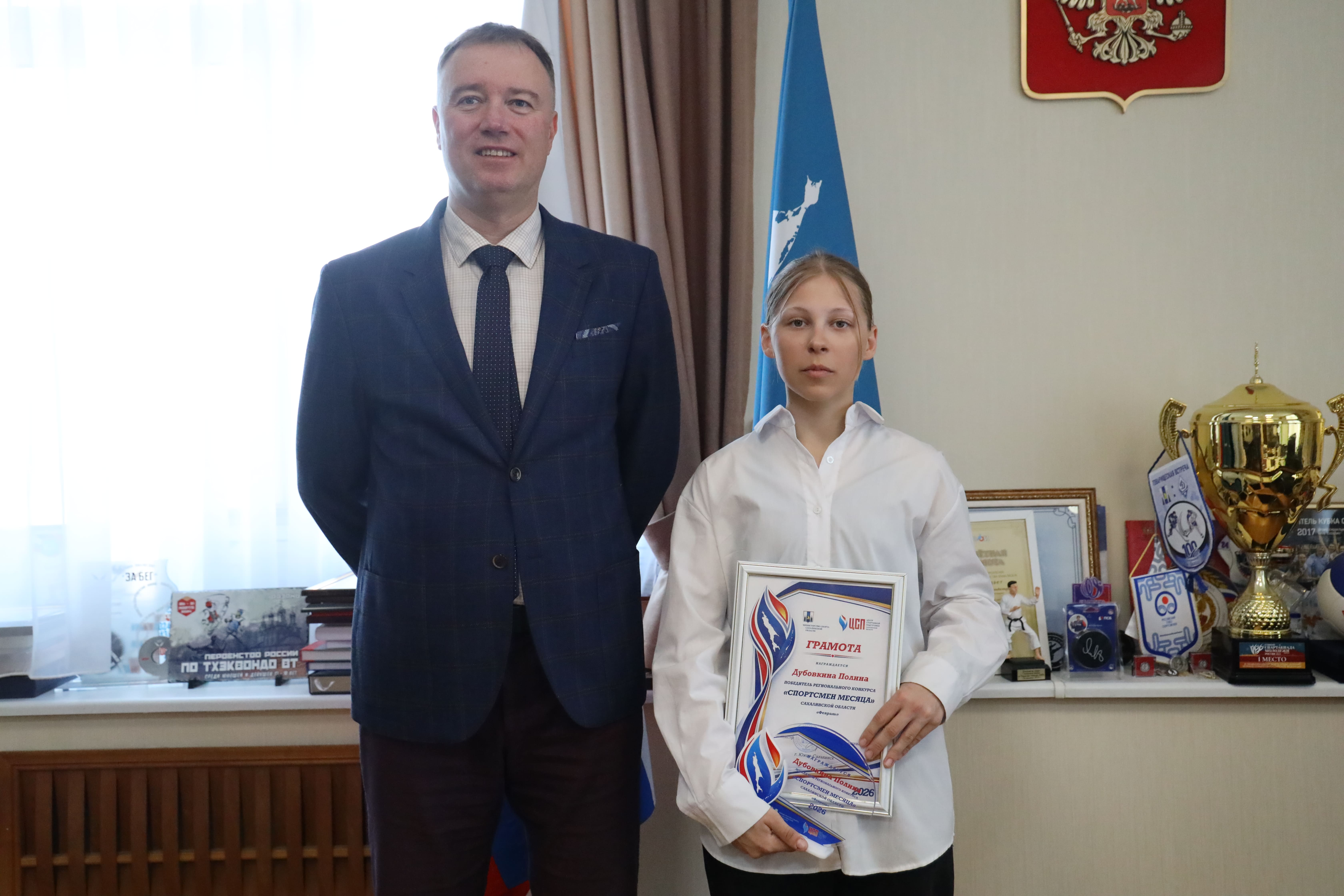 Церемония награждения победителя регионального конкурса «Спортсмен месяца» за февраль 2026 года прошла в министерстве спорта Сахалинской области. Заместитель министра спорта Станислав Тюрин вручил диплом и памятный подарок сахалинской лыжнице Полине Дубовкиной.