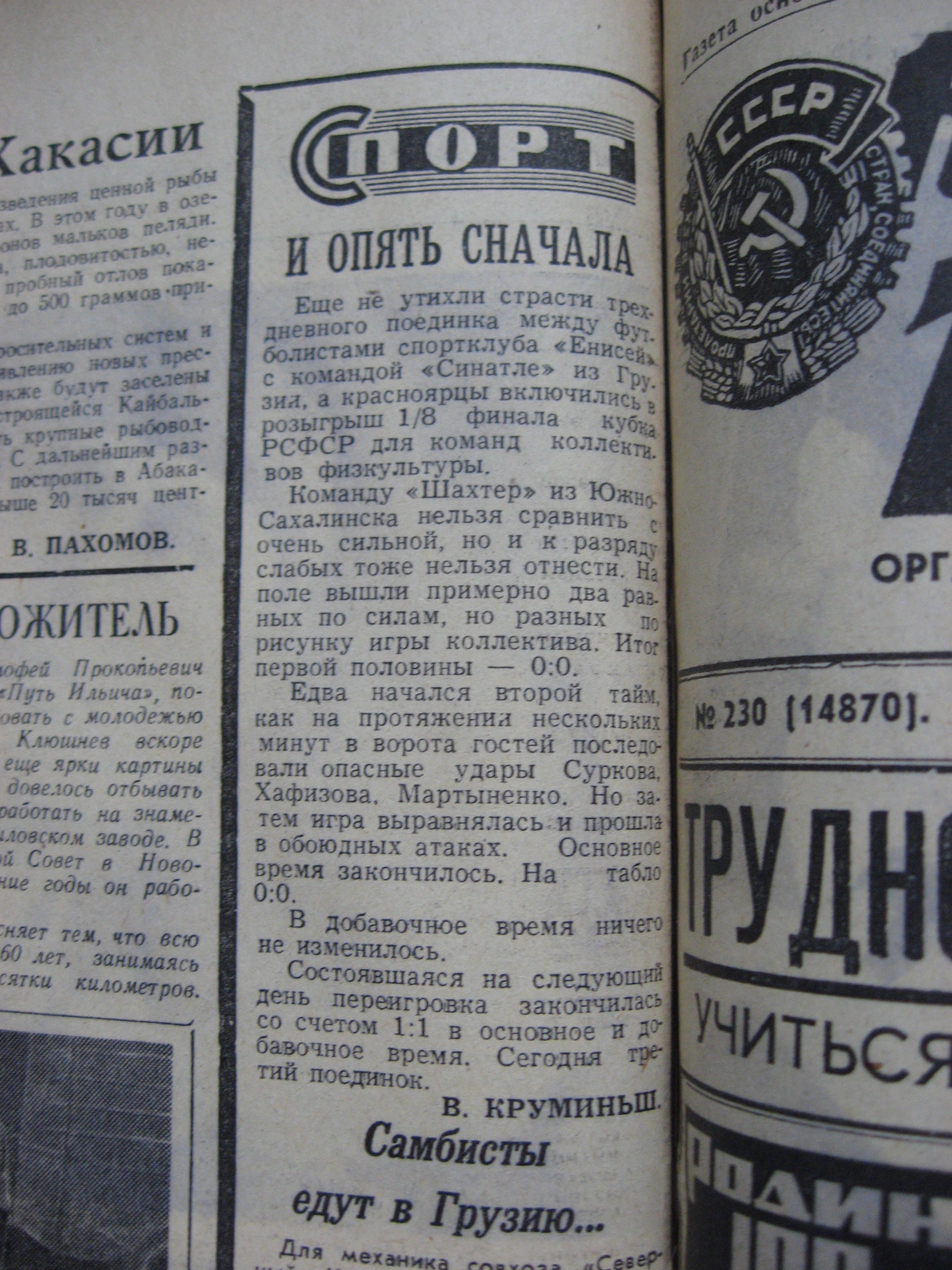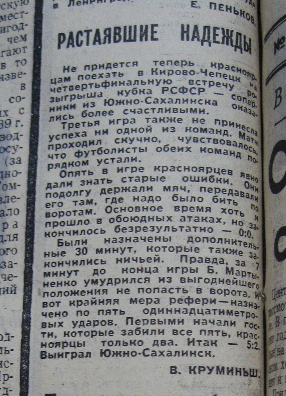 Однажды с этим столкнулись футболисты «Шахтера» (Южно-Сахалинск). В конце сентября 1968 года островитяне соперничали в Красноярске с местным «Рассветом» в рамках 1/4 финала Кубка РСФСР.