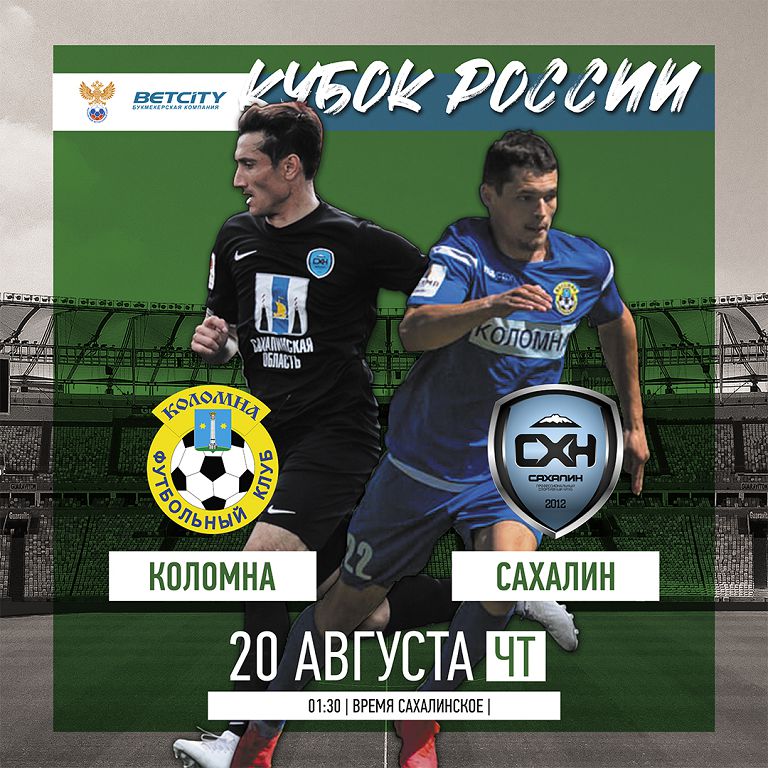19 августа «Сахалину» предстоит гостевой матч 1/128 финала Бетсити Кубка России 2020-2021 года. Соперником островитян будет ФК «Коломна». Матч пройдет в одноименном городе на стадионе «Труд». Начало в 17:30 по московскому времени (01:30 20 августа по сахалинскому).