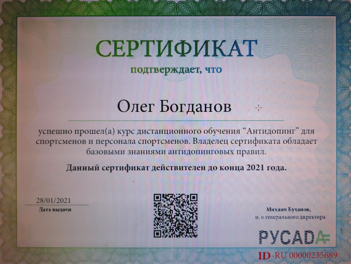 По итогам обучения ему был вручен сертификат, который свидетельствует, что Олег Богданов обладает базовыми знаниями антидопинговых правил.