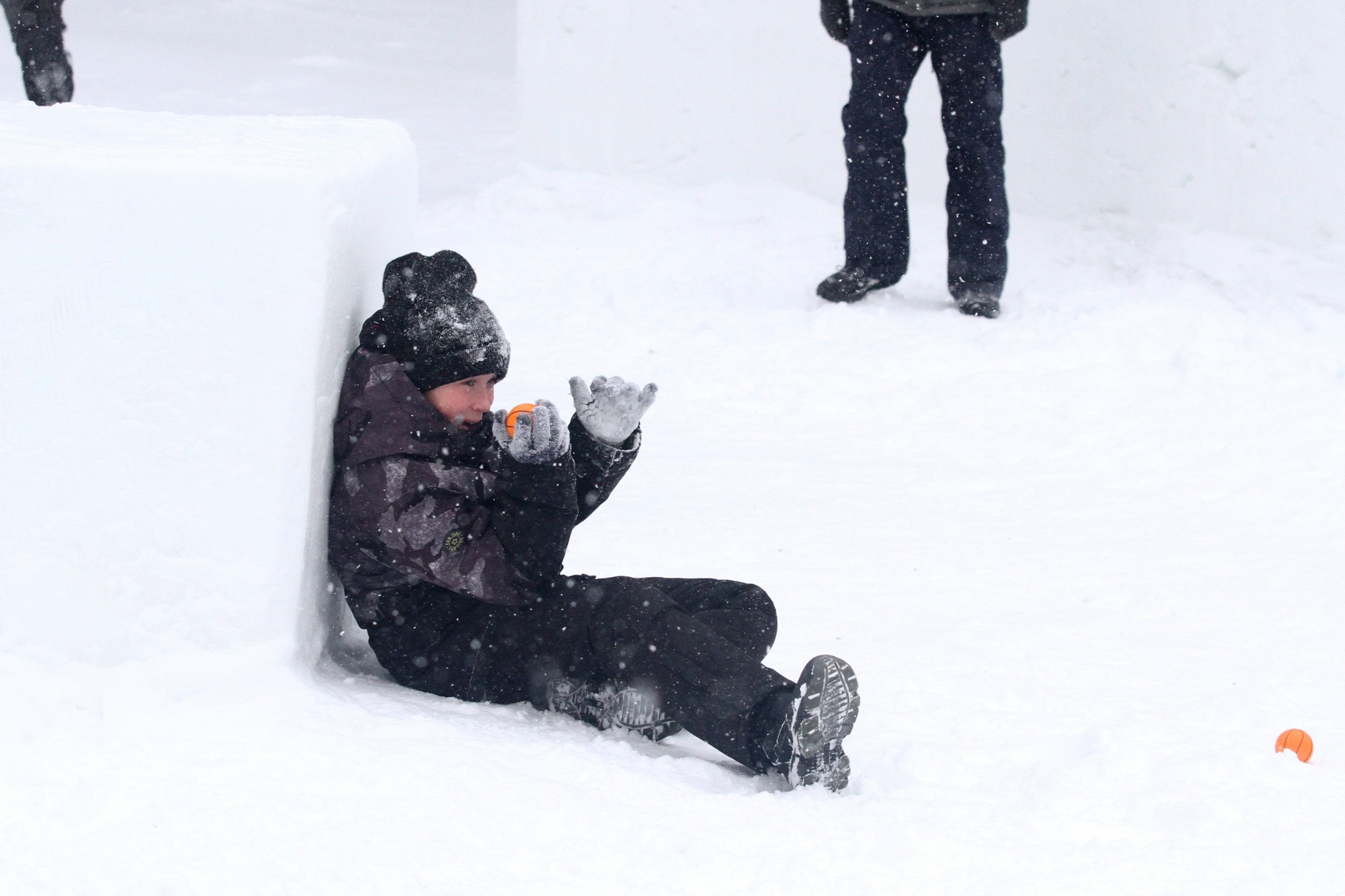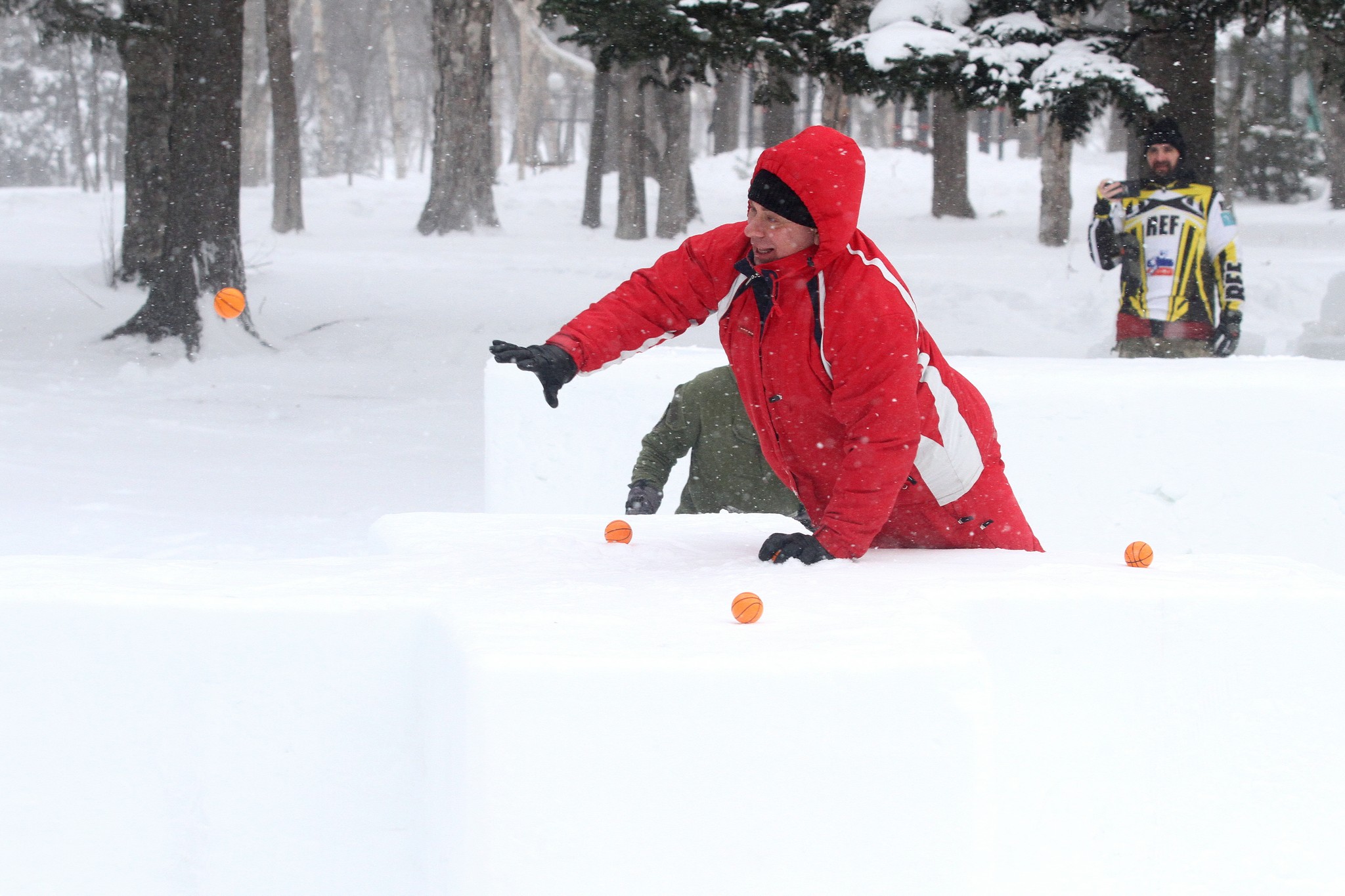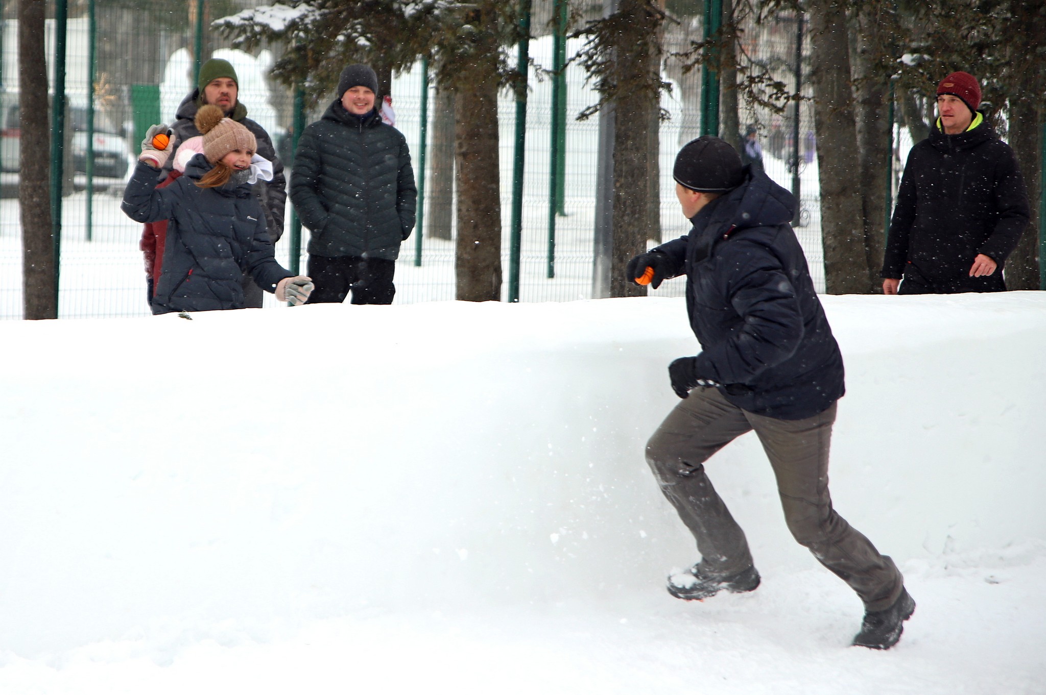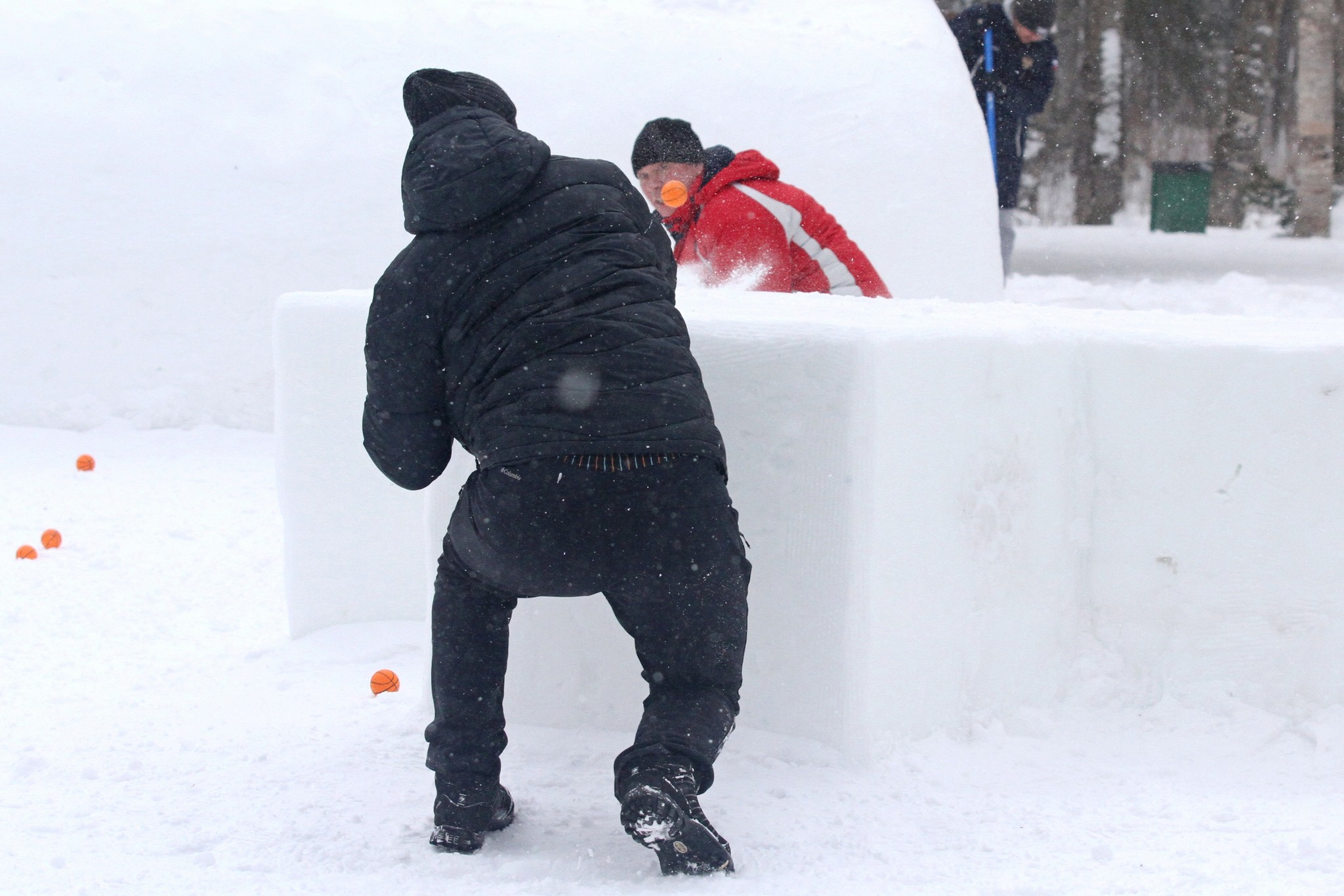 В качестве метательных снарядов можно было использовать как собственноручно сделанные из снега снежки, так и подготовленные организаторами заранее оранжевые маленькие мячики.