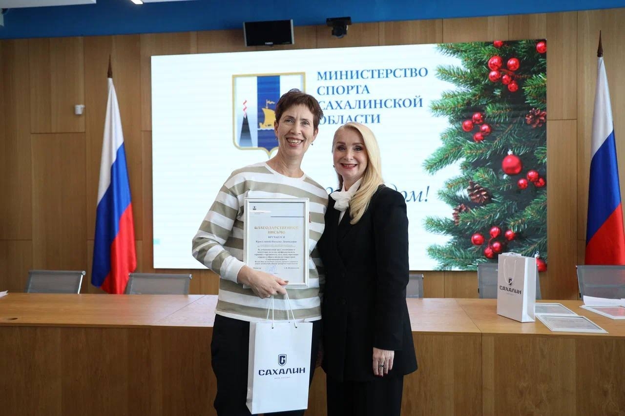 Заместитель министра спорта Сахалинской области Светлана Ходюш наградила благодарностью Министерства спорта России ведущего аналитика отдела развития физической культуры и массового спорта регионального министерства спорта Татьяну Никифорову за существенный вклад в развитие отрасли физической культуры и спорта Российской Федерации.